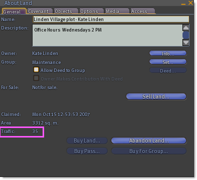 To see the traffic score for a parcel, right-click on the ground in the parcel and choose '''About Land'''; or choose '''World > Place Profile > About Land'''. | |||