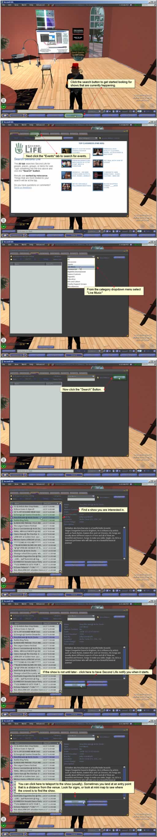 Shows step-by-step how to search for a show in Second Life. |