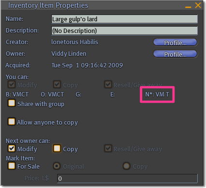 - N = Next Owner - The permissions the next person to own the object will have.