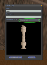 Notice that in the "Preview image as" dropdown box there's a new option: "Sculpted Prim". This is your last chance to be sure everything is ok before you spend L$ on the upload, so use it! If you're satisfied, hit the Upload button and wait for the upload to complete.