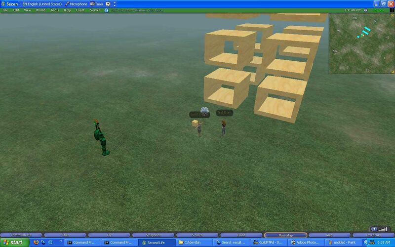 Here I am and there I am. In the end, I was able to connect 3 clients, but I'm sure it'll handle more - since this server is on a wireless connection, I didn't want to push it. I'm able to create objects in-world, and upload textures for them as you see.