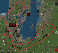 M3 - Central Satori is almost entire a road vehicle. This tour is very good to get a clear image of inner Satori. It is detached from an isolated base, a shop without road or water access. With the help of some teleports, it gets to the main road of Satori and goes all the way to North, to make an uncomplete bubble in north. Then, it goes to South, where it makes another uncomplete bubble. This is because the road network of Satori has big problems, with missing parts. This is not due to a natural obstacle (almost all the continent is a plain or a plateau) or to a natural cataclism, it is all caused by accidental land sale. So, the pods must use multiple teleports to get accross gaps. Another surprise is the presence of a lake in South, with an unfinished bridge. There are many lakes on this continent, but majority of them are without road access.